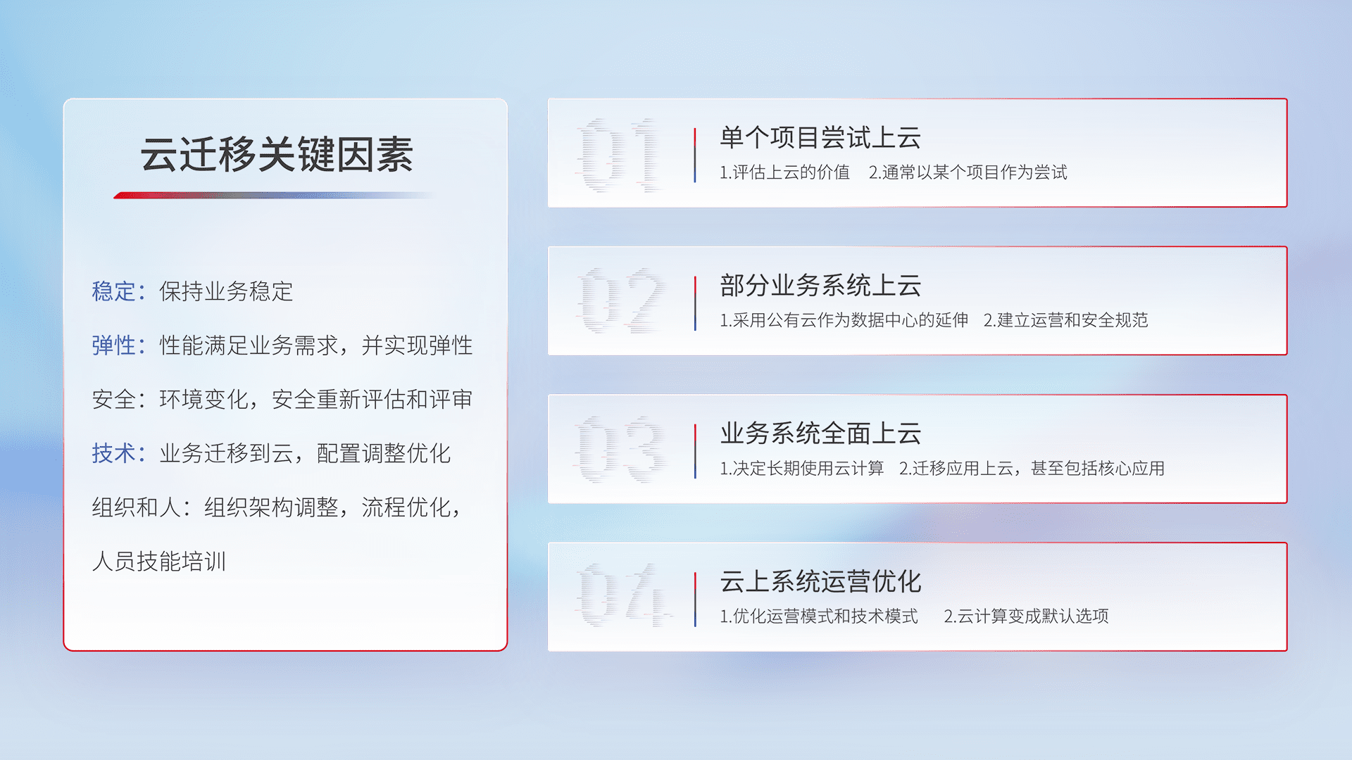 结合实际业务,,,从规划设计、、、云平台选型、、云原生改造、、数据迁移、、集成交付,,,,迁移全过程为客户识别最佳上云路径,,,做好风险识别管理,,,设计网络架构、、、身份权限、、、、安全审计合规、、、、操作审计、、、、日志审计、、、、监控告警策略、、、多站点容灾设计等,,,对云上基础设施进行整体规划,,提升IT治理水平,,,以满足弹性、、、高可用、、、高性能的需求。。。