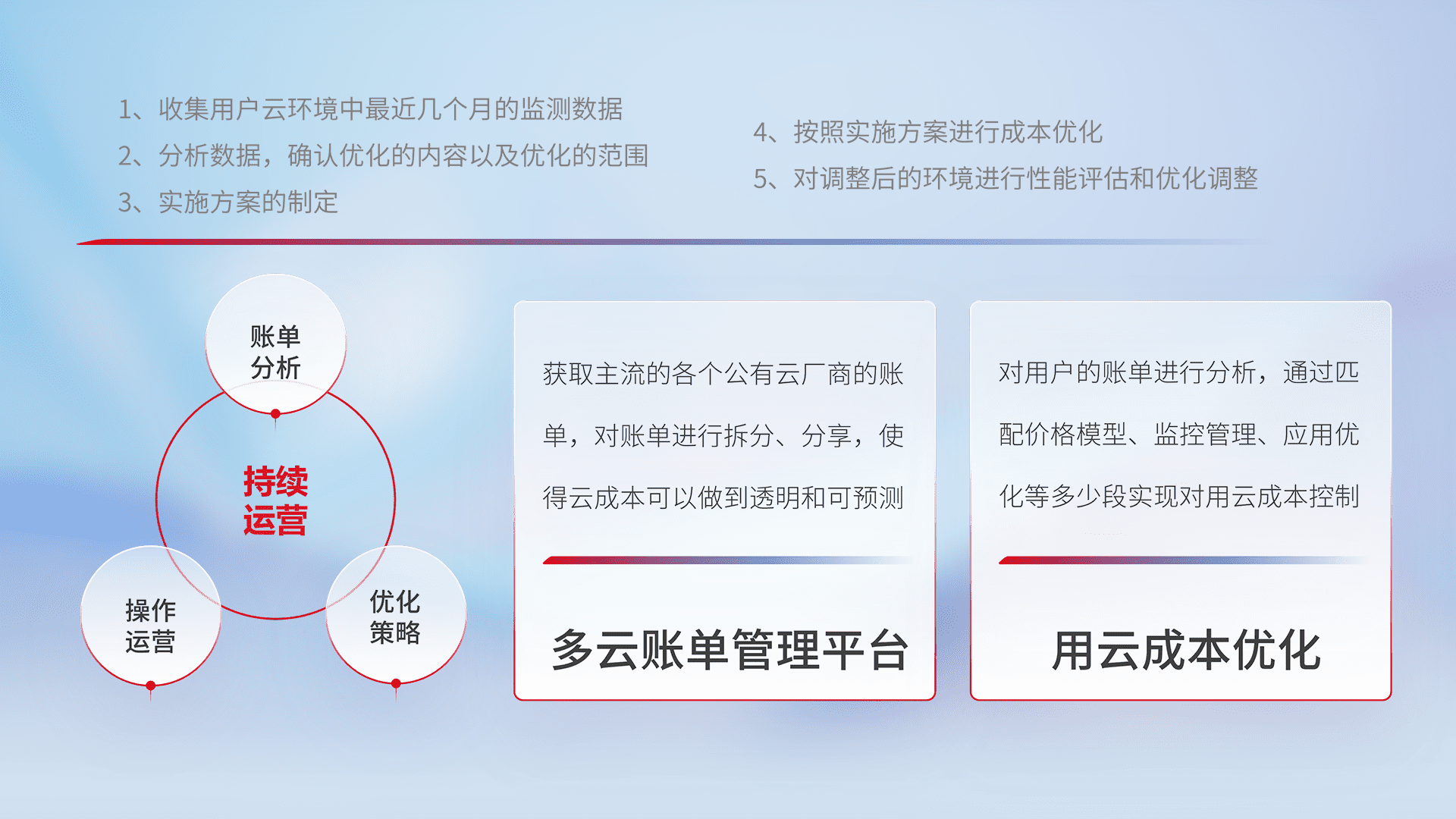 通过多云纳管,,,以统一的资源数据模型把客户的云资源进行抽象和封装,,,,进而实现对多云资源的统一操作,,保障云资源管理的可靠性、、、、稳定性与可用性。。。。量身定制化运维内容,,配置、、、、开发运维、、、、补丁管理、、、、备份、、、、监控、、、认证和访问管理、、审计和日常巡检等,,,,保障在用云过程中的可靠度,,,稳定度以及高可用率。。