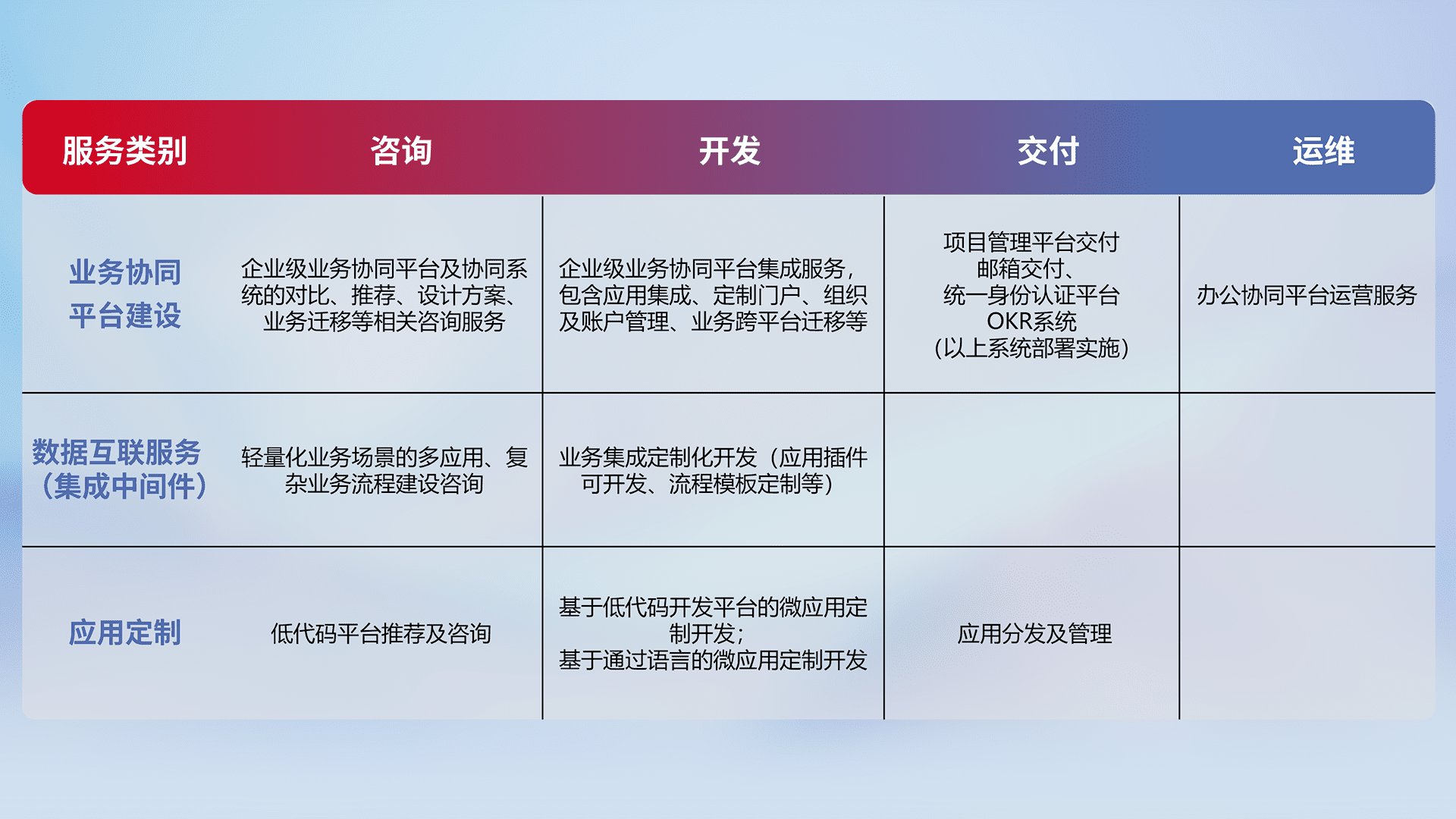 针对钉钉、、企微、、IDaas等平台级产品提供产品的规划、、、方案、、、、交付、、、、定制化开发等服务,,,,实现如统一协同办公、、、智能客户服务、、、混合会议管理、、、智能数据查询、、、、等业务场景,,,实现数字化转型。。